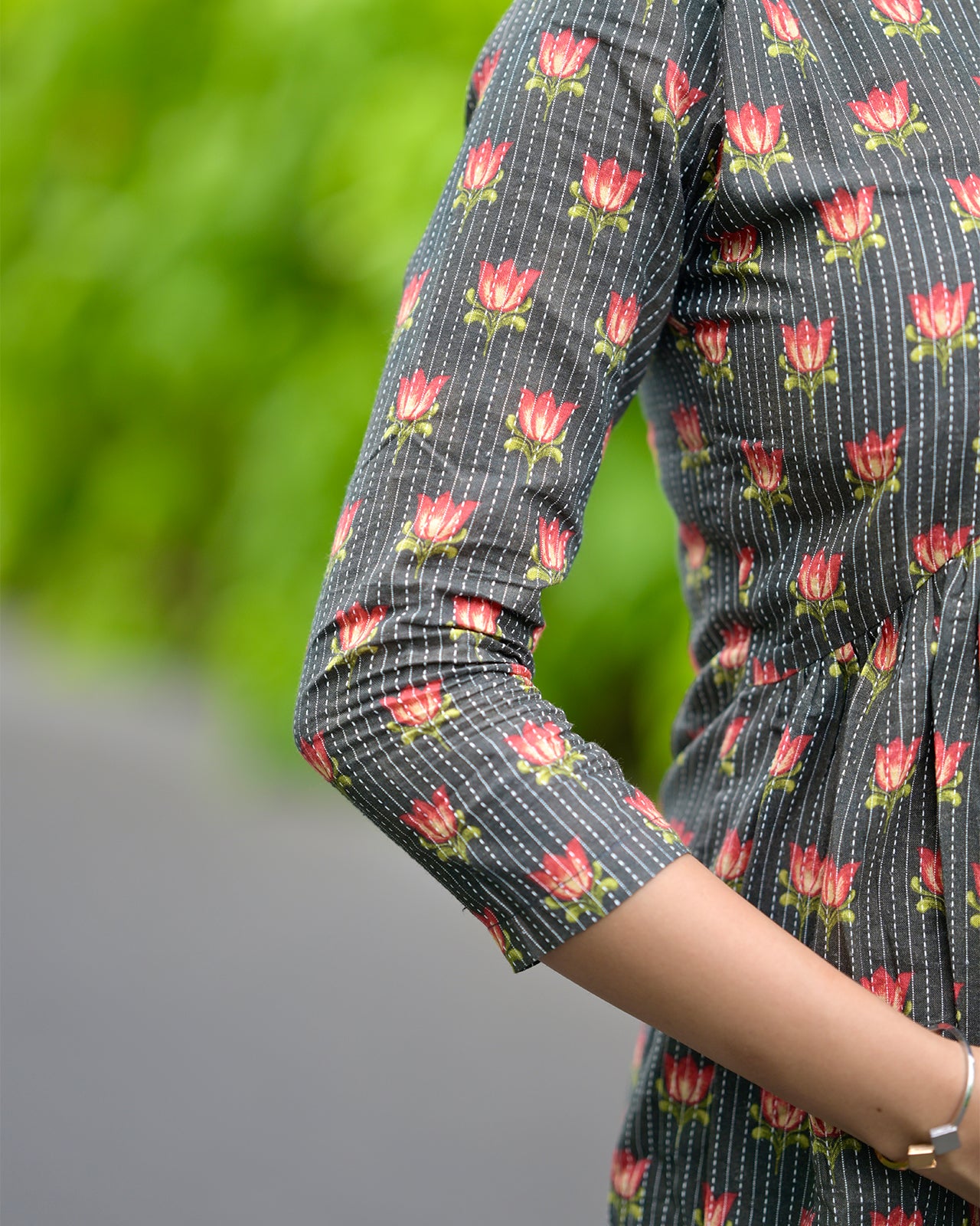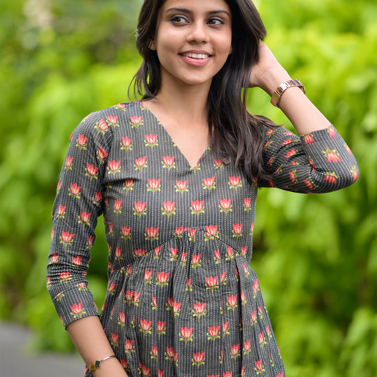 Step into a world where style doesn’t shout — it whispers. This Kurti is a serene expression of effortless elegance. Crafted in soft cotton with a charcoal grey base, it features an all-over lotus floral prints in warm crimson and olive — a symbolic bloom of beauty and resilience.