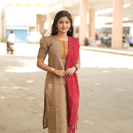 A graceful beige cotton kurta paired with a red straight pant and dupatta, adorned with subtle gold zari borders. The kurta features a round neckline with contrast gold detailing add a refined, festive touch, while the lightweight fabric of the dupatta drapes gracefully. The look is minimalist yet elegant, making it perfect for office ethnic days, small festive gatherings and temple visits.