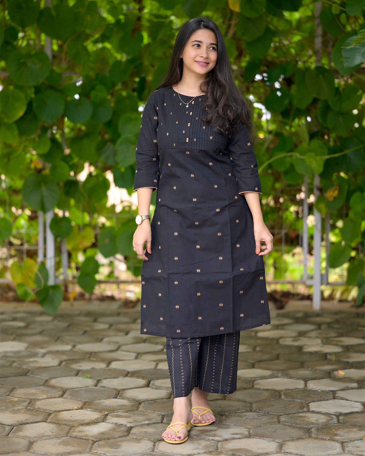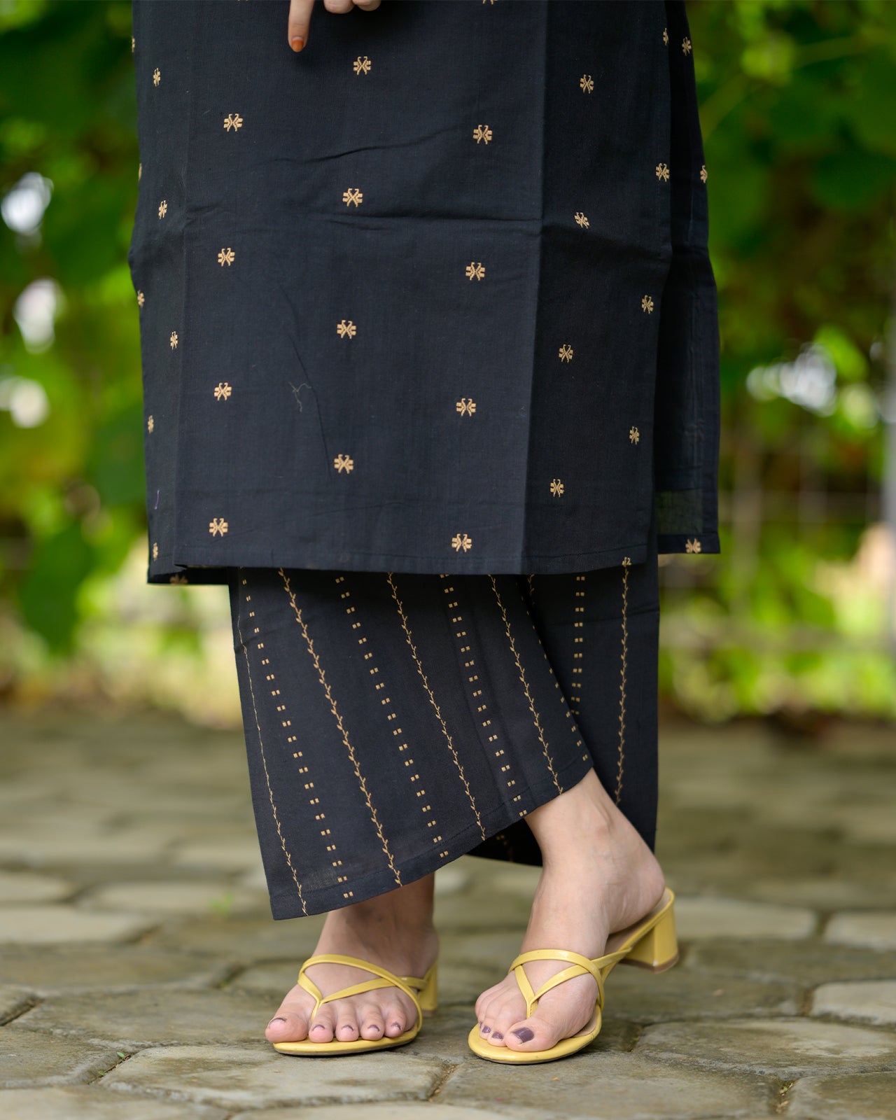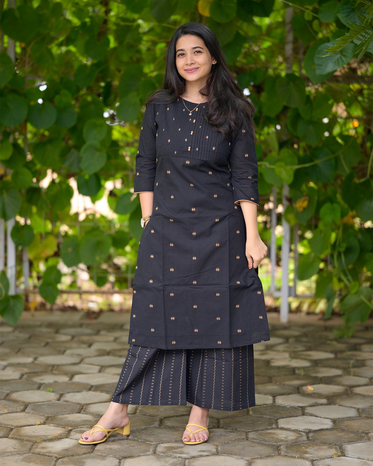 Elevate your everyday wardrobe with this sleek and stylish black kurti set featuring a straight-fit kurti and matching palazzo pants. The kurti is adorned with subtle gold buti prints, designed with a round neckline and 3/4th sleeves for a classic look. Paired with a comfortable striped palazzos,  for a modern, coordinated look that’s both comfortable and elegant. It’s perfect for work, small gatherings, or casual festive wear.