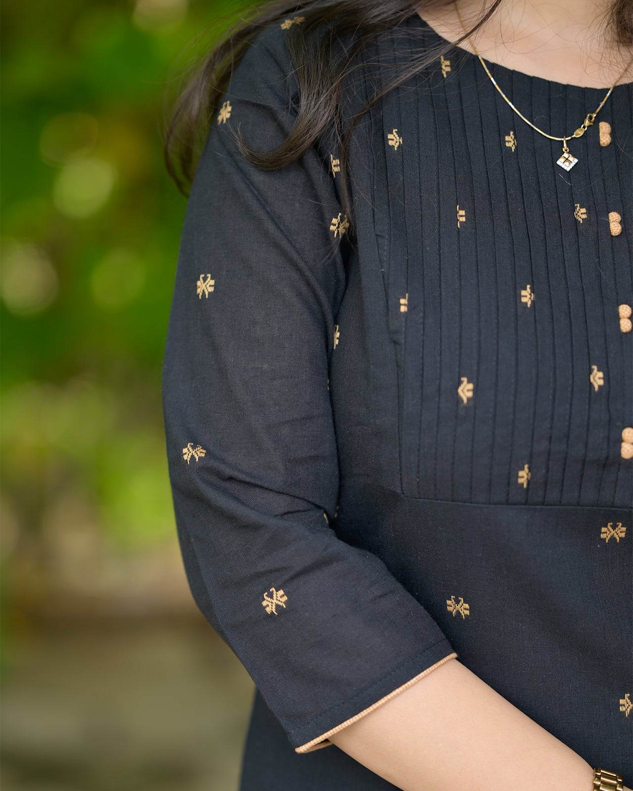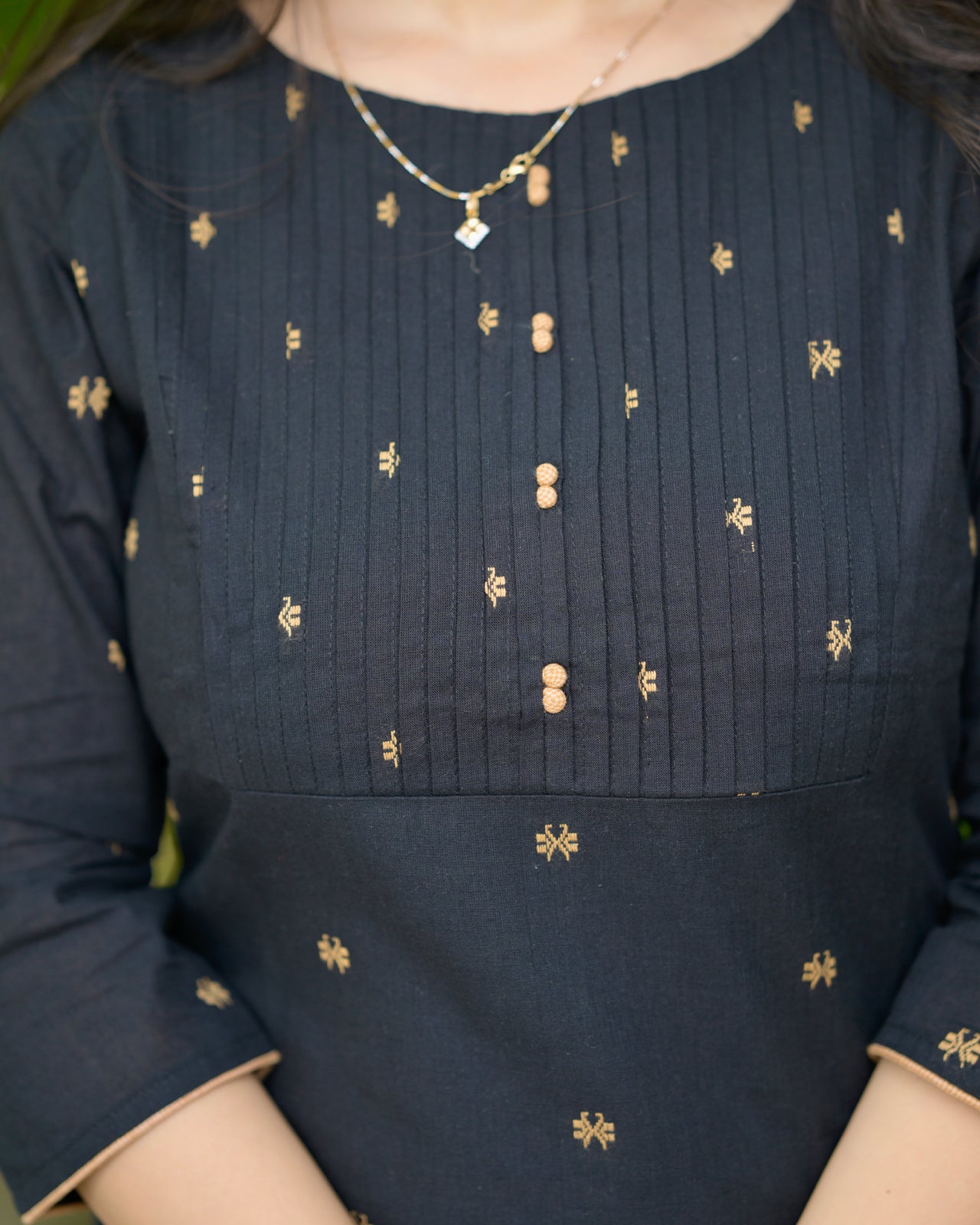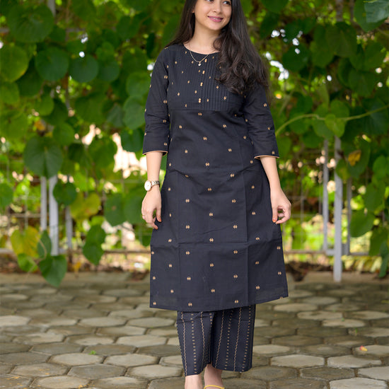 Elevate your everyday wardrobe with this sleek and stylish black kurti set featuring a straight-fit kurti and matching palazzo pants. The kurti is adorned with subtle gold buti prints, designed with a round neckline and 3/4th sleeves for a classic look. Paired with a comfortable striped palazzos,  for a modern, coordinated look that’s both comfortable and elegant. It’s perfect for work, small gatherings, or casual festive wear.