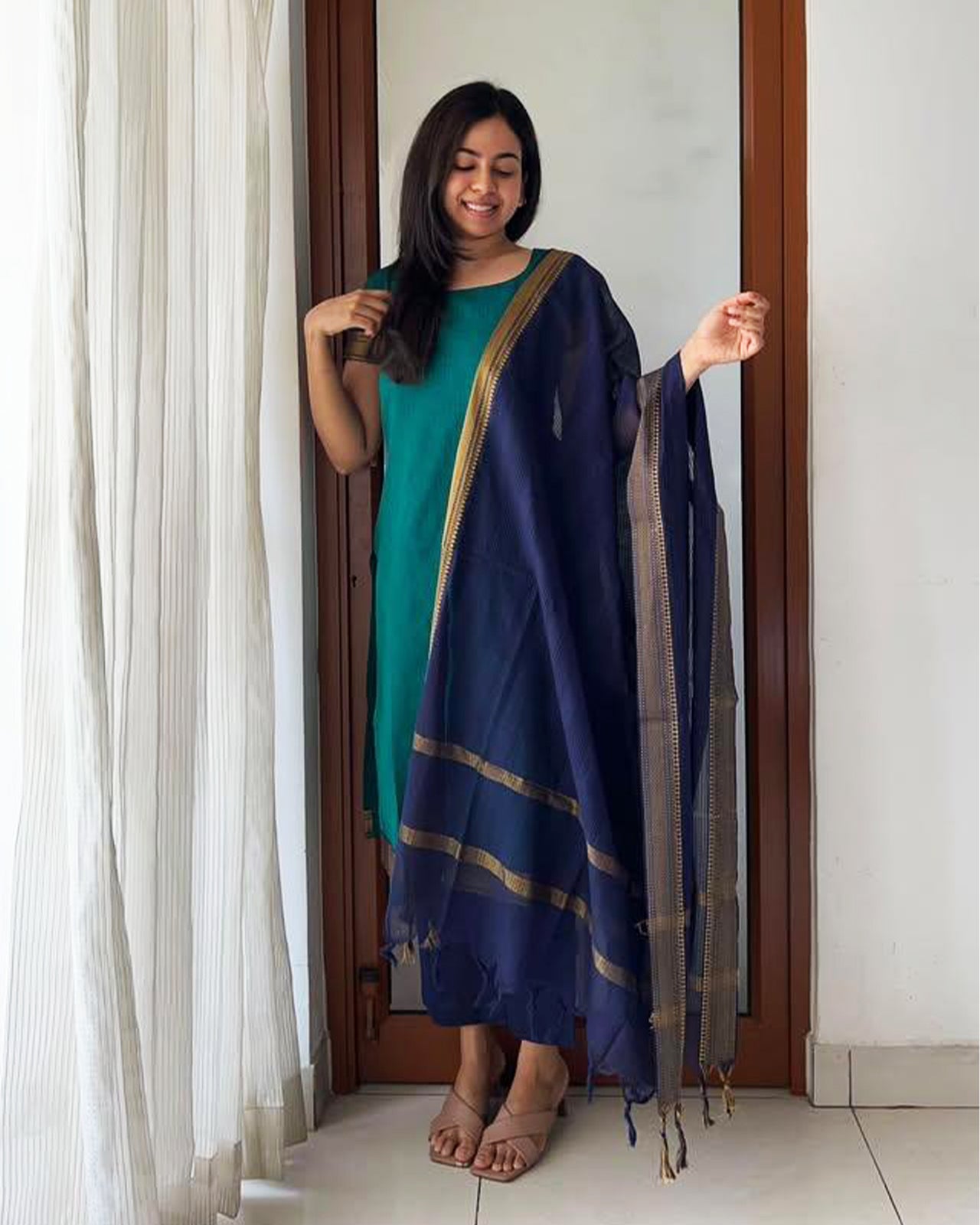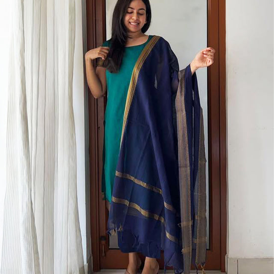 A graceful teal-green cotton kurta paired with a deep blue straight pant and dupatta, adorned with subtle gold zari borders. The gold detailing along the edges and stripes at the hem add a refined, festive touch, while the lightweight fabric of the dupatta drapes gracefully. The look is minimalist yet elegant, making it perfect for office ethnic days, small festive gatherings, temple visits.