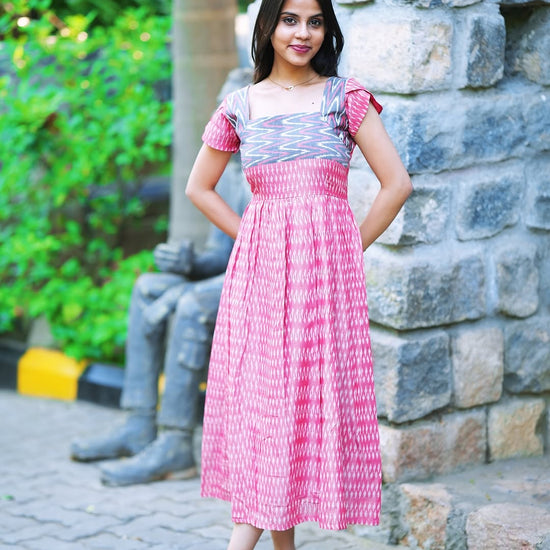 Refresh your wardrobe with this beautiful Ballerina Pink and Grey Ikkat Frock, inspired from our gorgeous actress Rashmika Mandanas wardrobe. The outfit revamps your style with timeless classics.