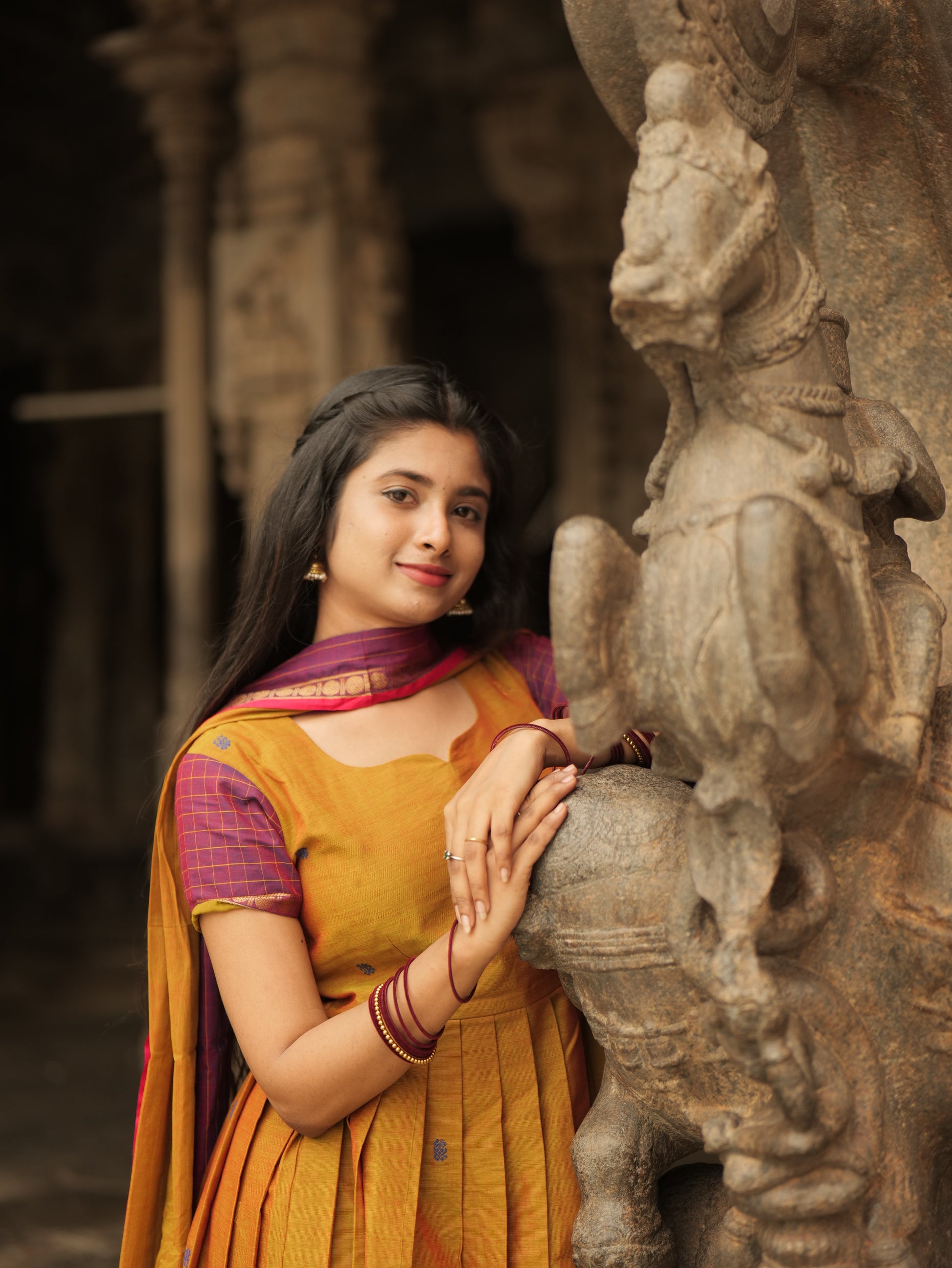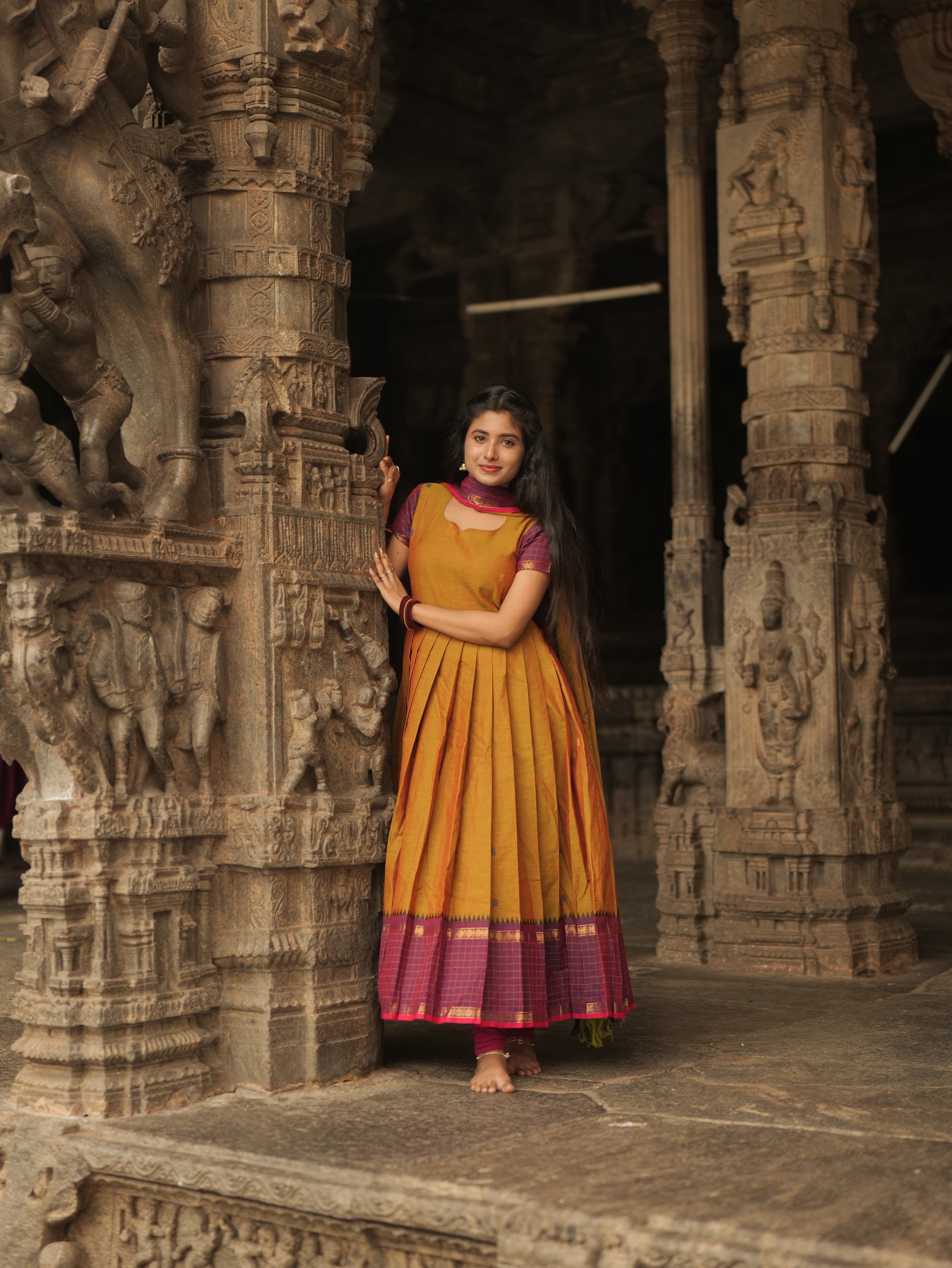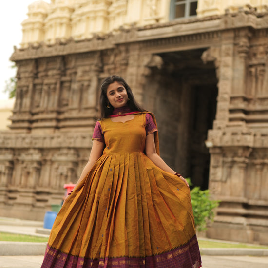 A graceful mustard yellow Anarkali captures the essence of timeless South Indian elegance. The flowing flare of the dress is beautifully balanced with a rich purple border. Woven in traditional Chettinad cotton this Anarkali is paired with a matching dupatta that adds depth and heritage charm. The short sleeves and simple neckline bring understated grace, making it an effortless choice for temple visits, festive gatherings, or family occasions.