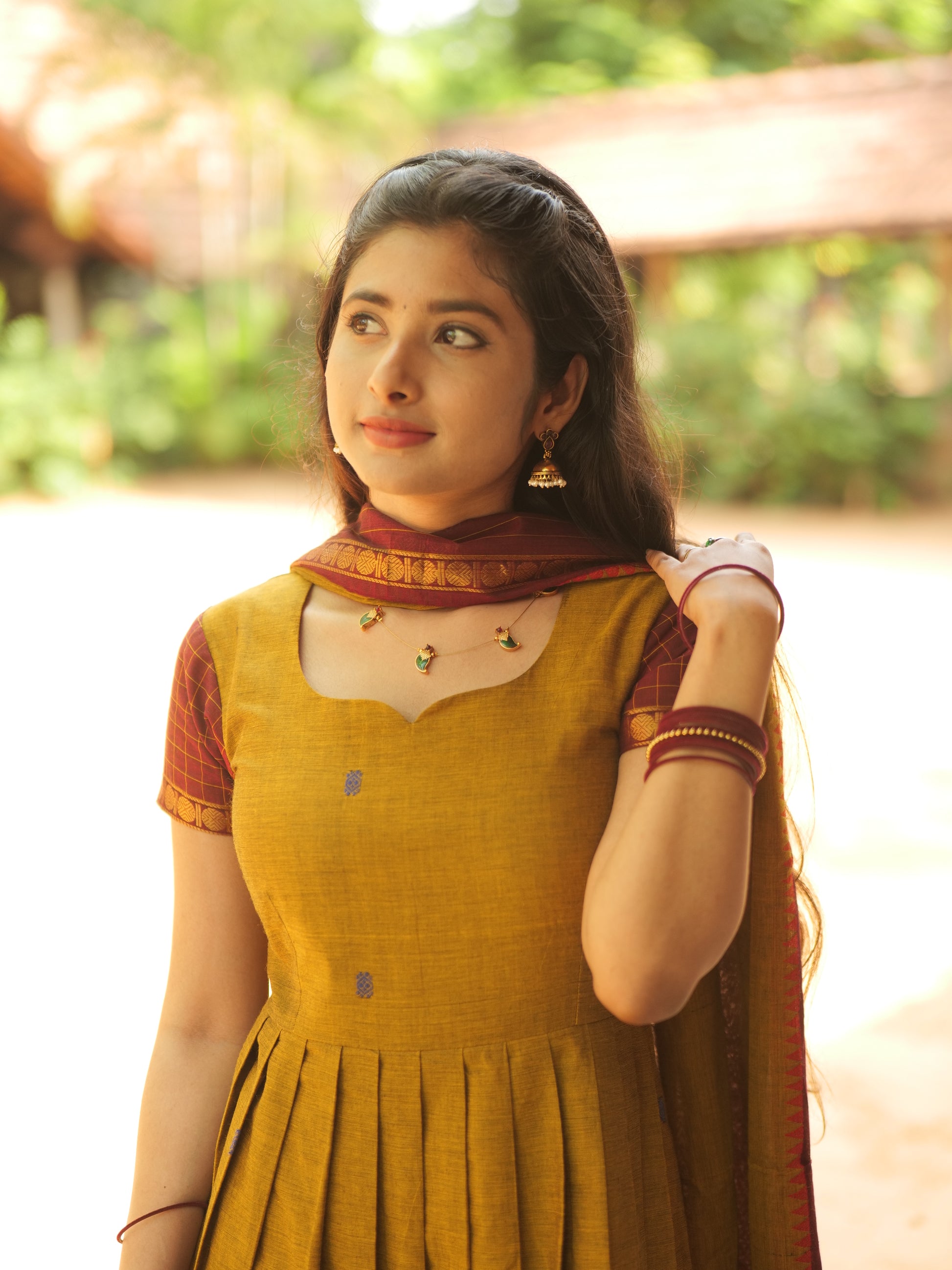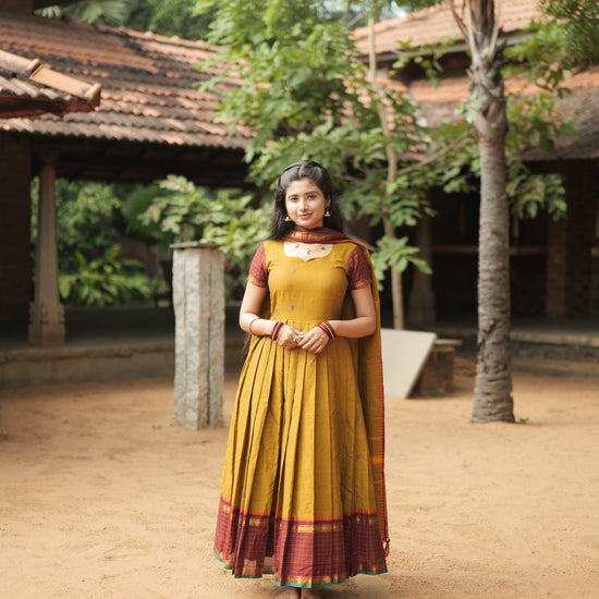 A graceful mustard yellow Anarkali captures the essence of timeless South Indian elegance. The flowing flare of the dress is beautifully balanced with a rich purple border. Woven in traditional Chettinad cotton this Anarkali is paired with a matching dupatta that adds depth and heritage charm. The short sleeves and simple neckline bring understated grace, making it an effortless choice for temple visits, festive gatherings, or family occasions.