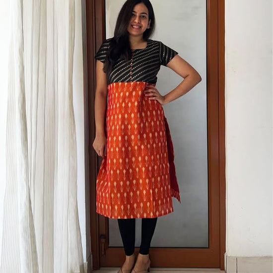 A beautifully crafted kurti that blends traditional charm with modern flair. The kurti features a striking black brocade  with on the bodice, creating a bold contrast with the vibrant orange ikat-printed flare below. Designed with a classic round neckline, short sleeves, it’s perfect for workdays, casual outings, or festive gatherings.