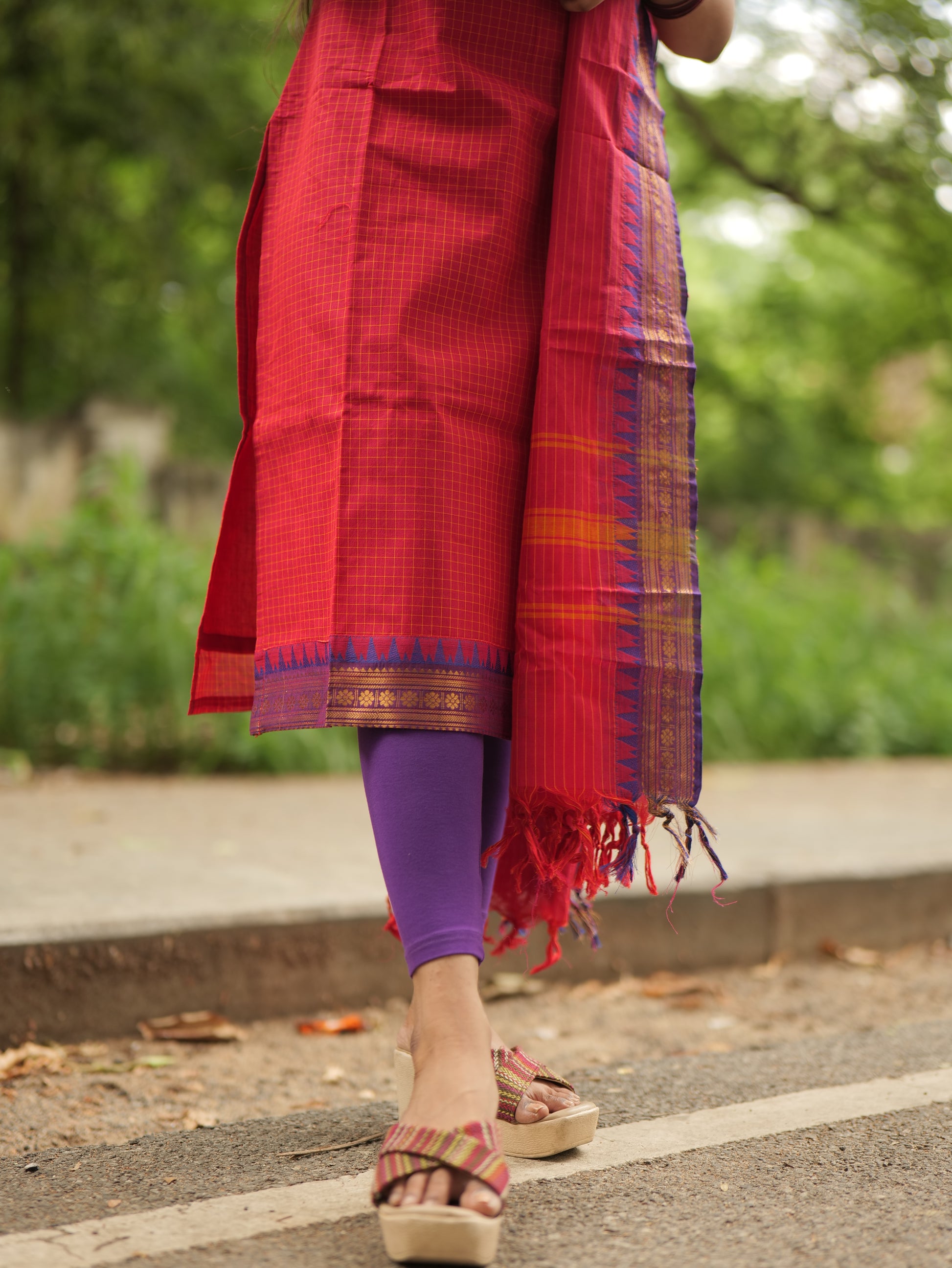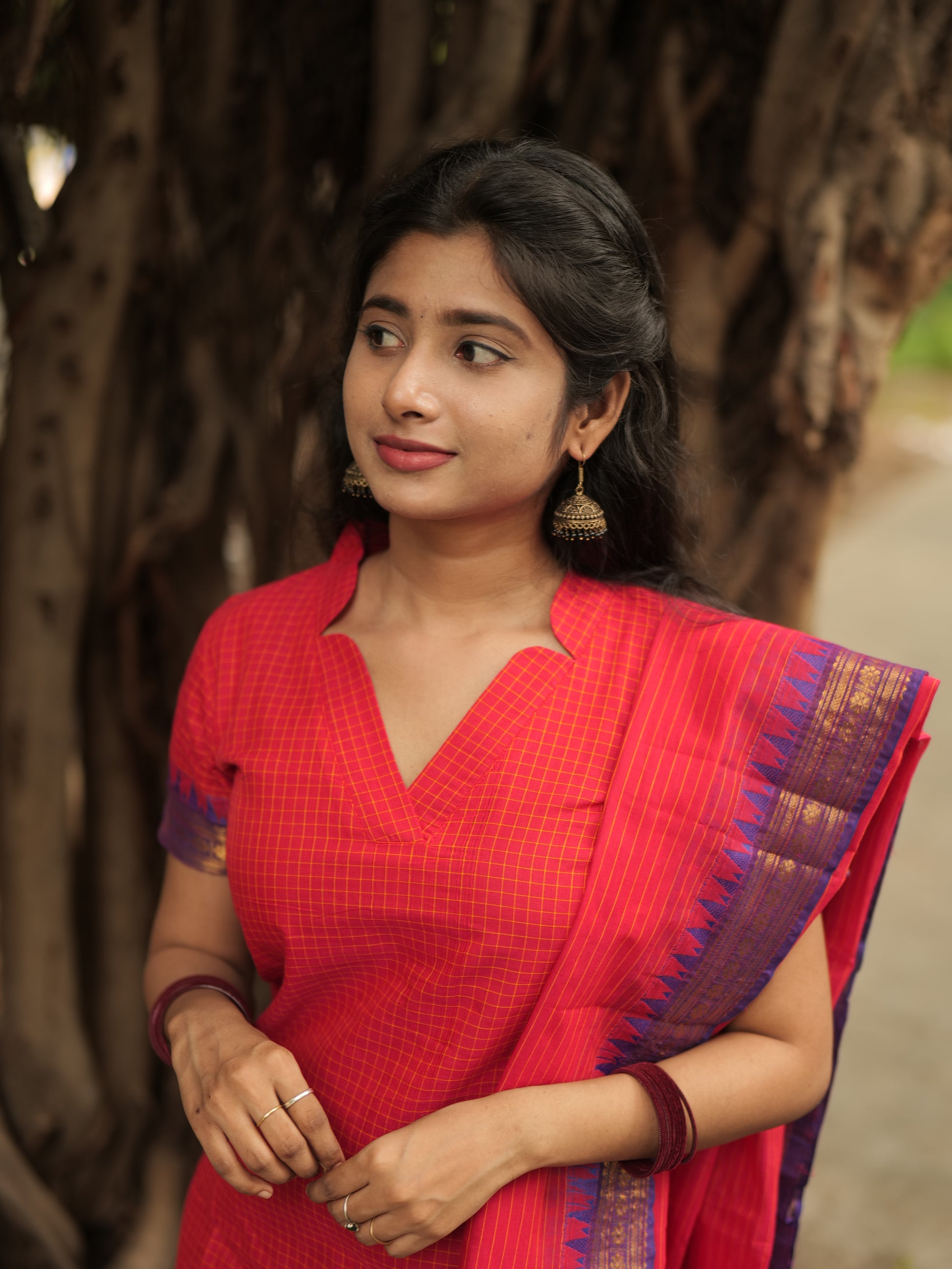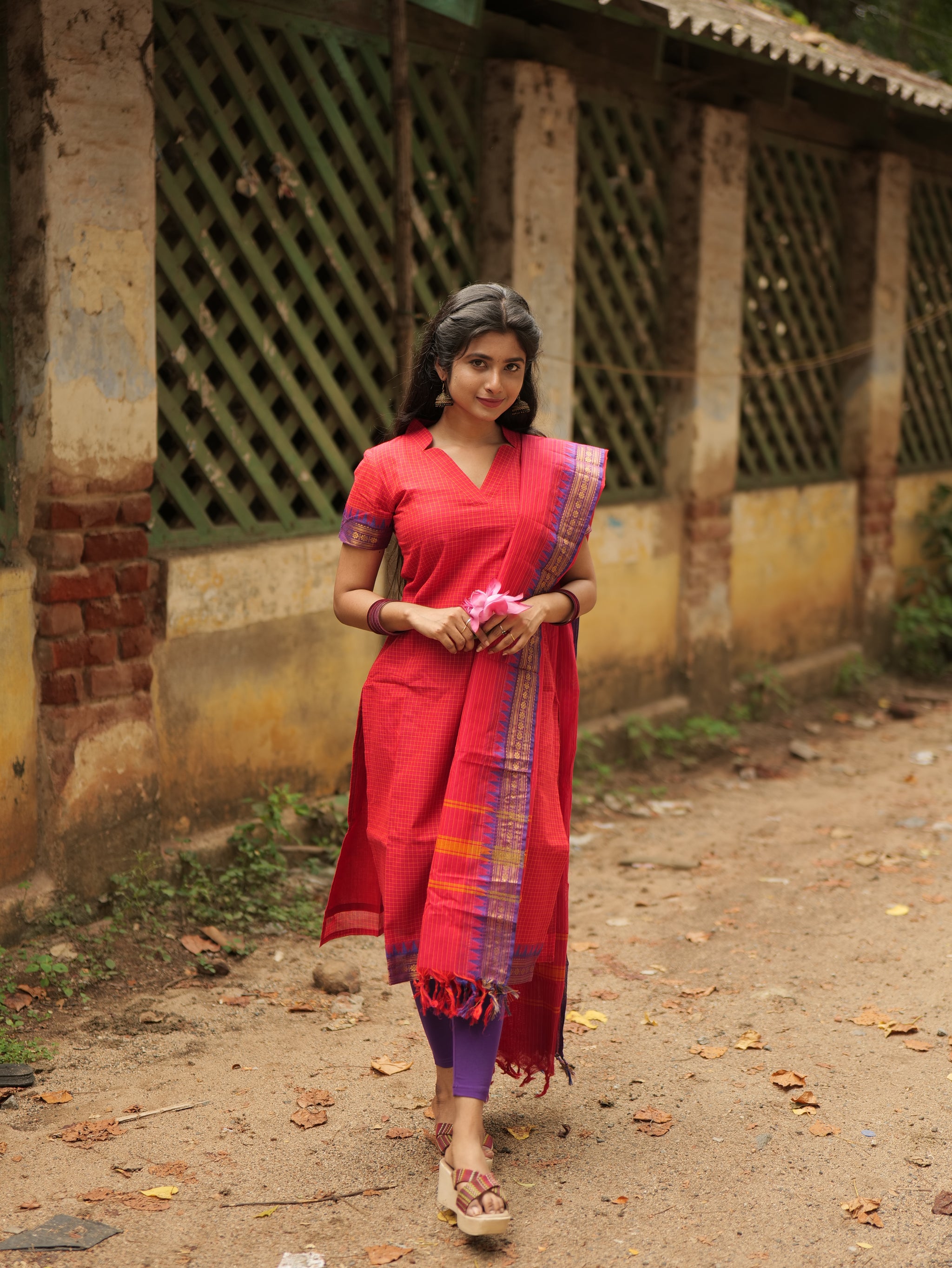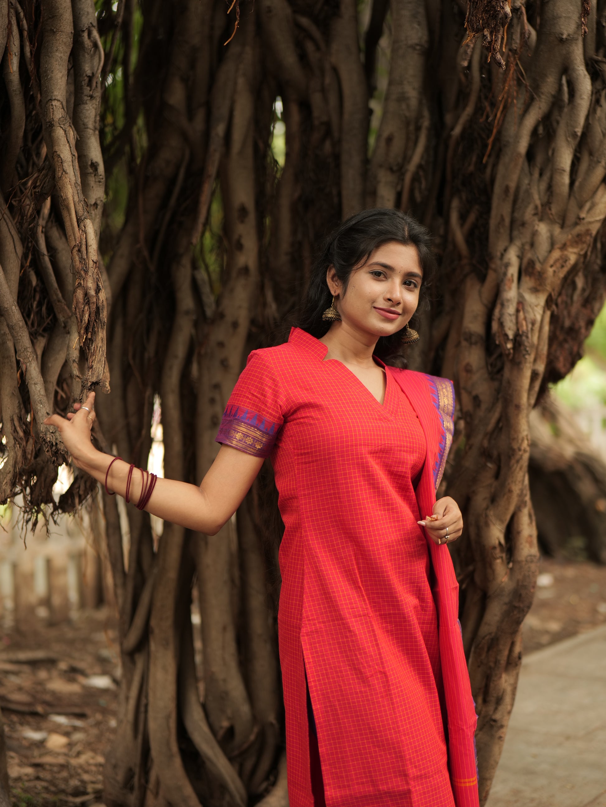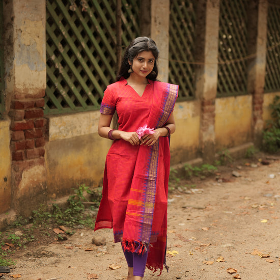 Elevate your elegance with this vibrant pink Chettinad cotton salwar featuring subtle golden checks across the body and a contrasting purple-gold zari border. Paired with a striking matching dupatta this outfit beautifully blends simplicity with festive charm. The lightweight fabric drapes gracefully, making it perfect for everyday elegance, cultural occasions, or casual gatherings.