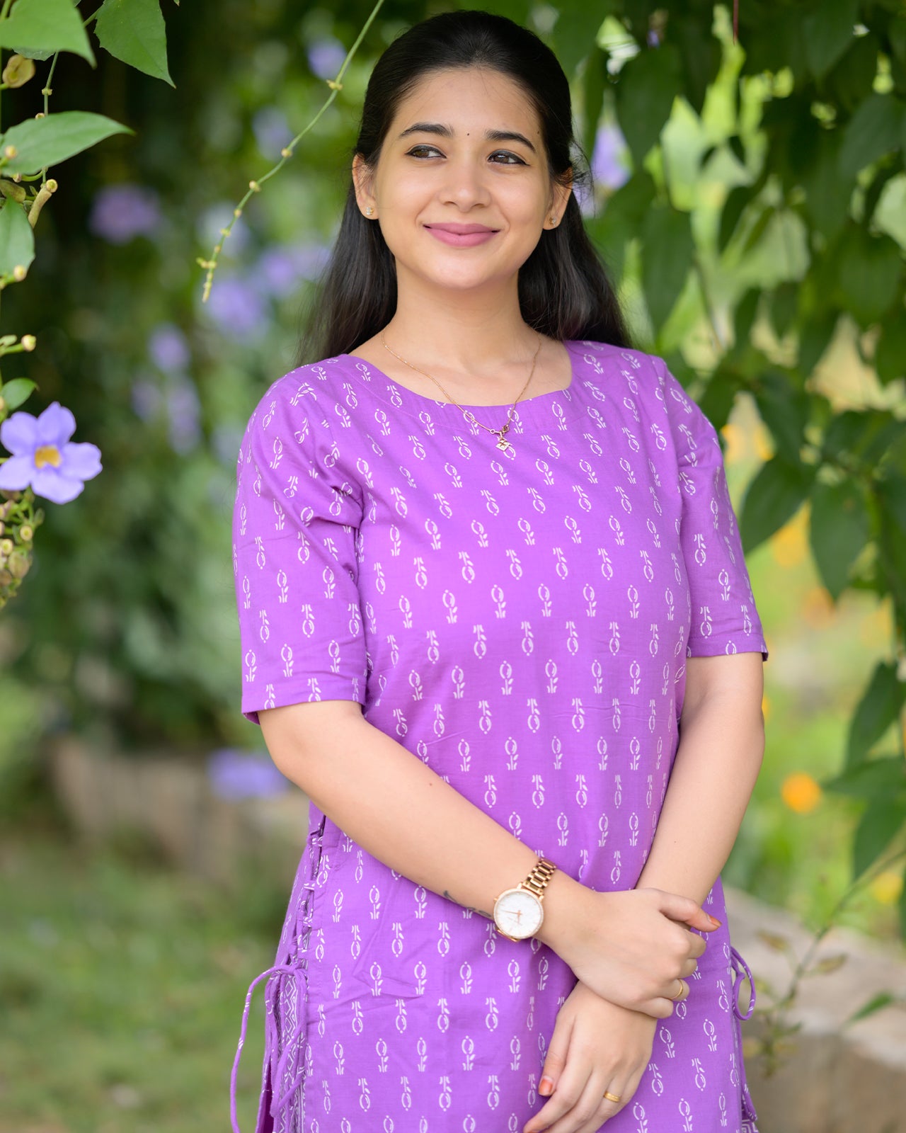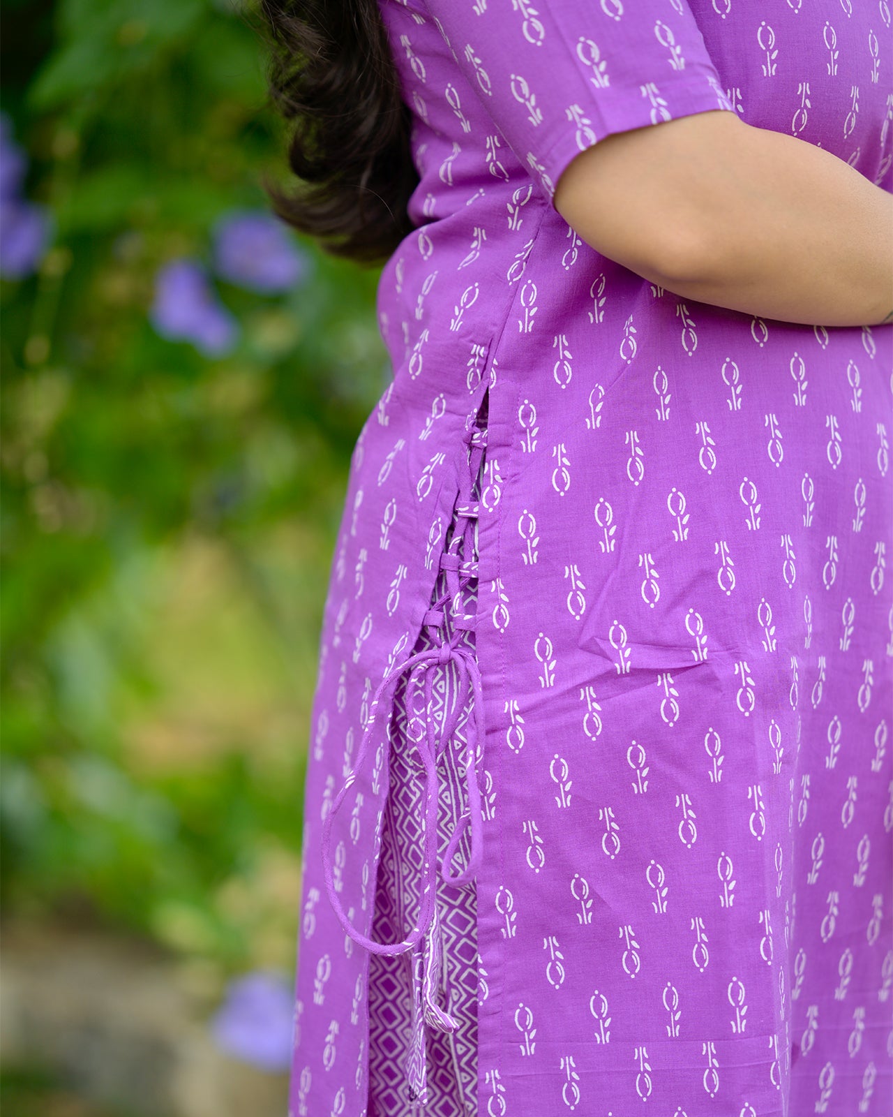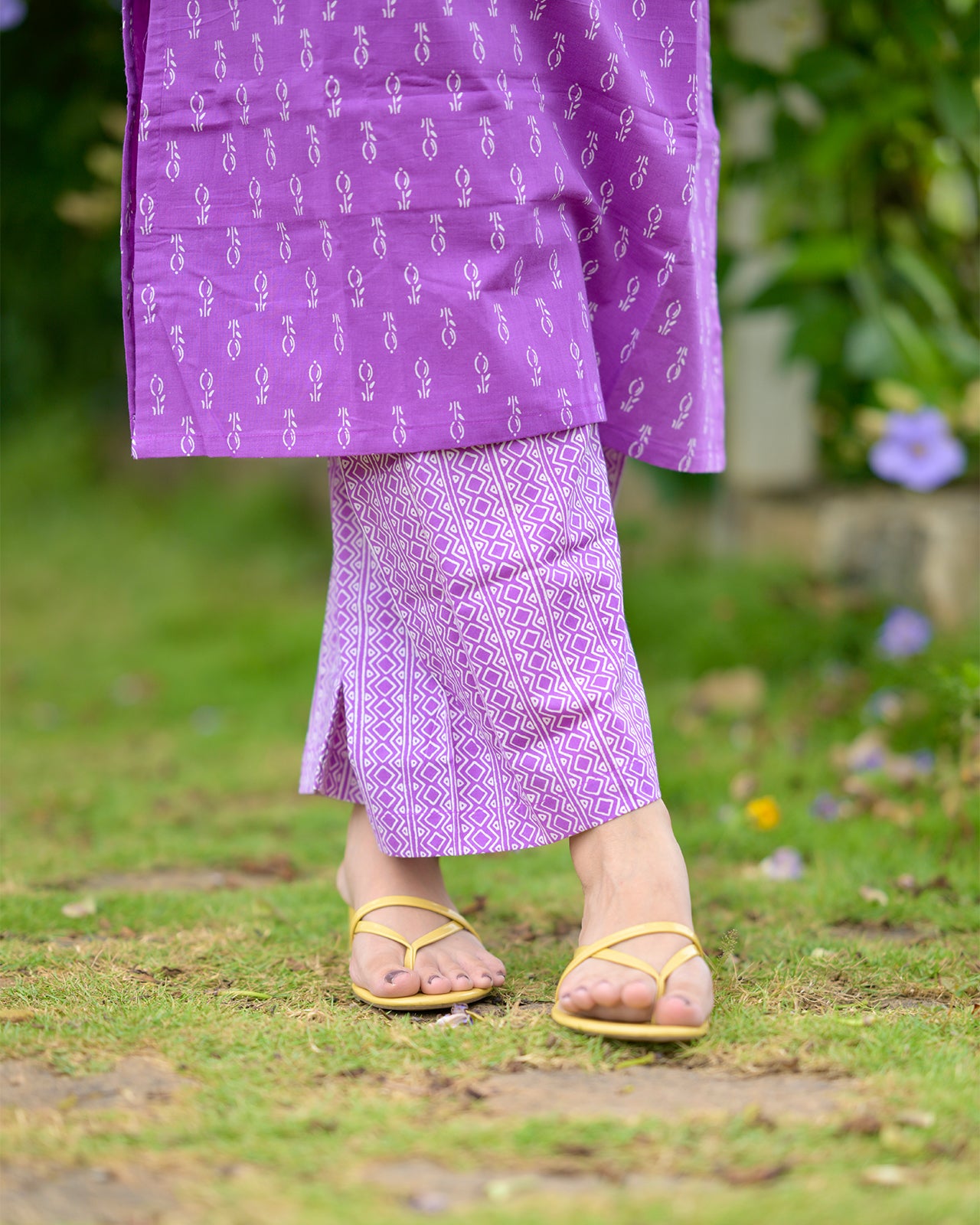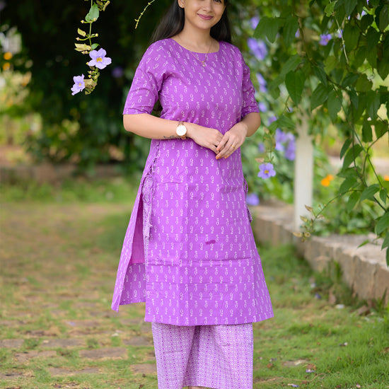 Bask in the serenity of soft lavender with this beautifully printed kurti set — a gentle blend of charm and comfort. Crafted in soft cotton, this lilac-hued ensemble features delicate block prints on the kurta, paired with intricately patterned straight pants that add subtle texture to your look.