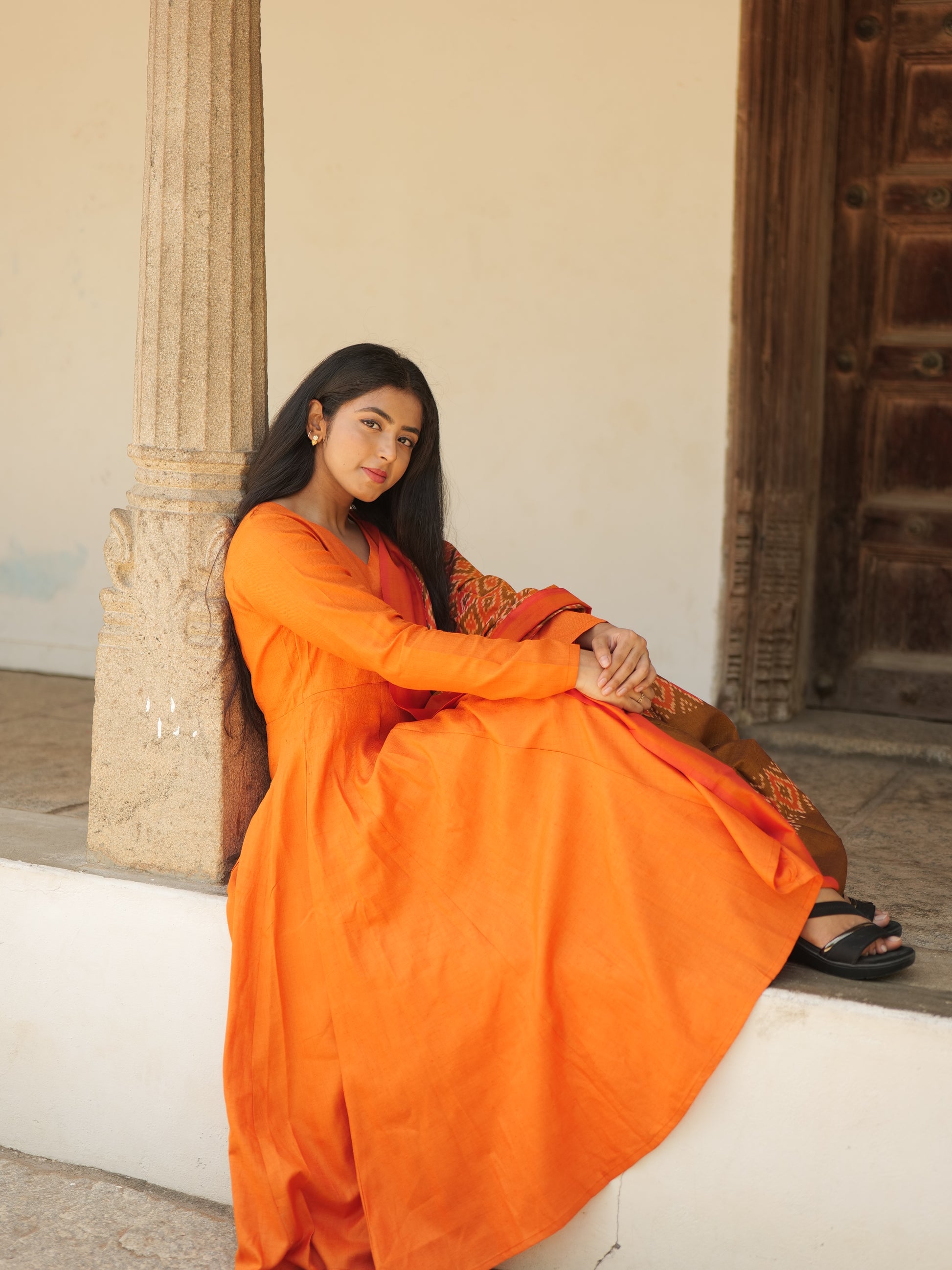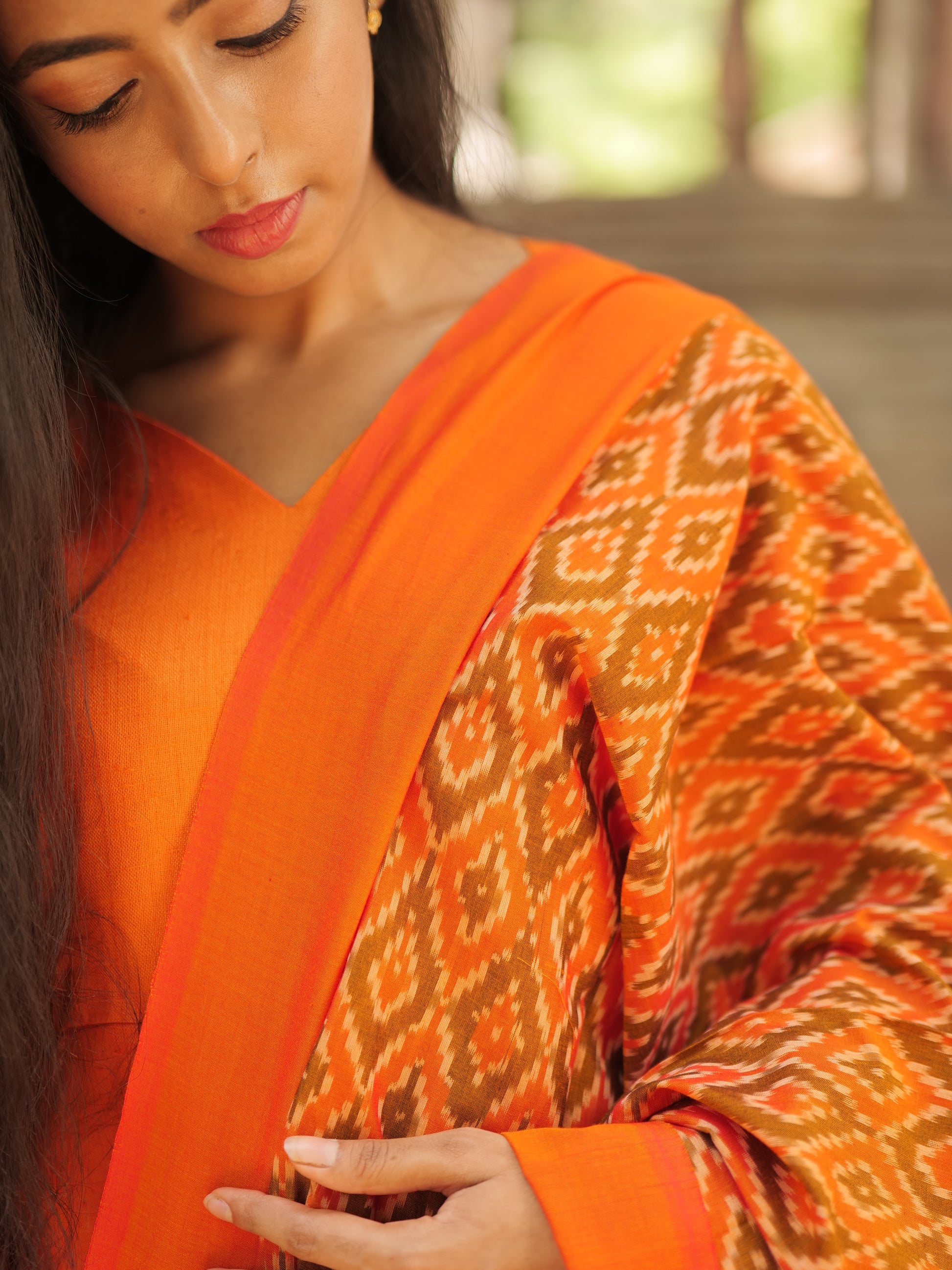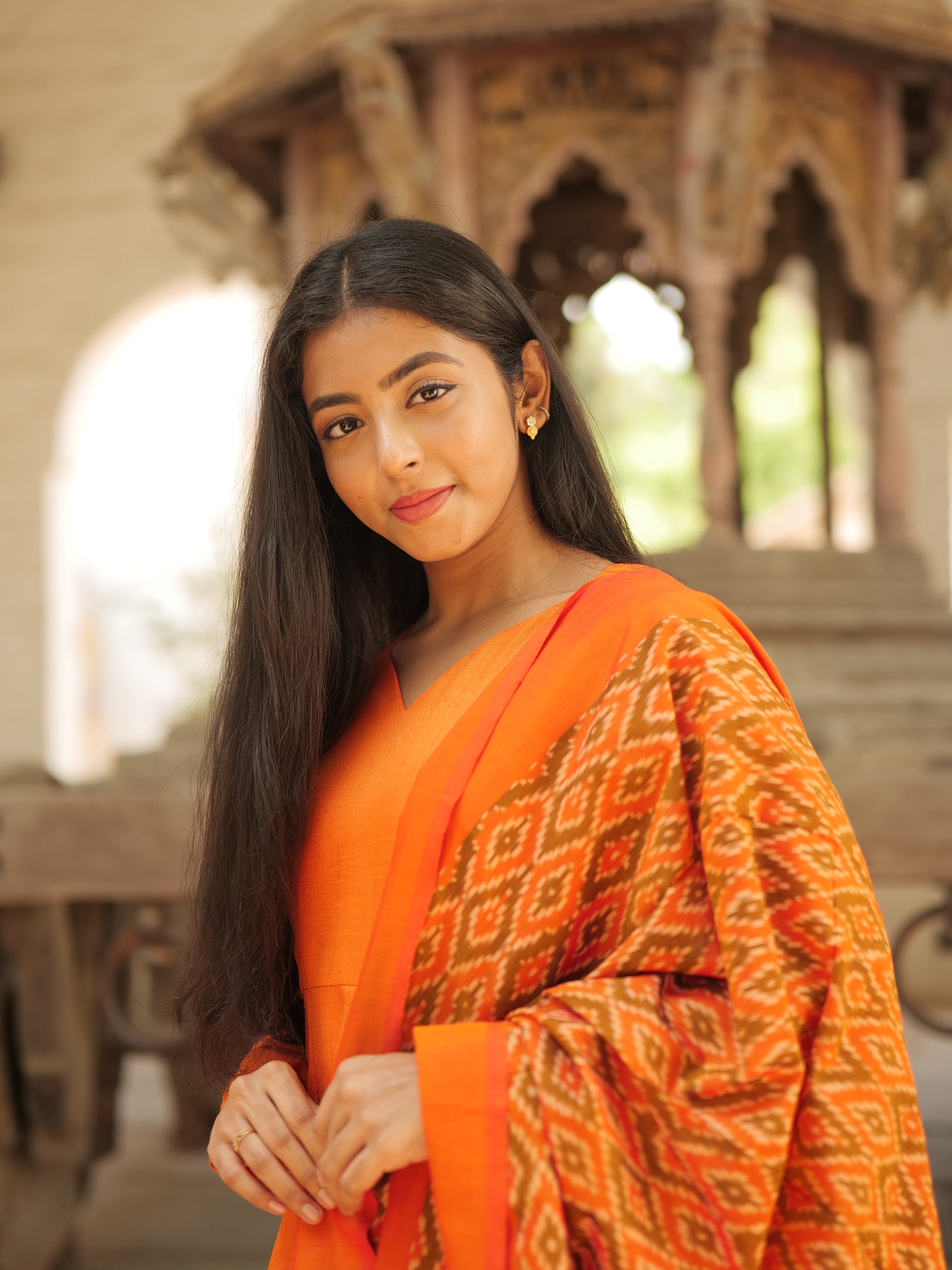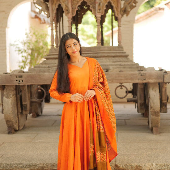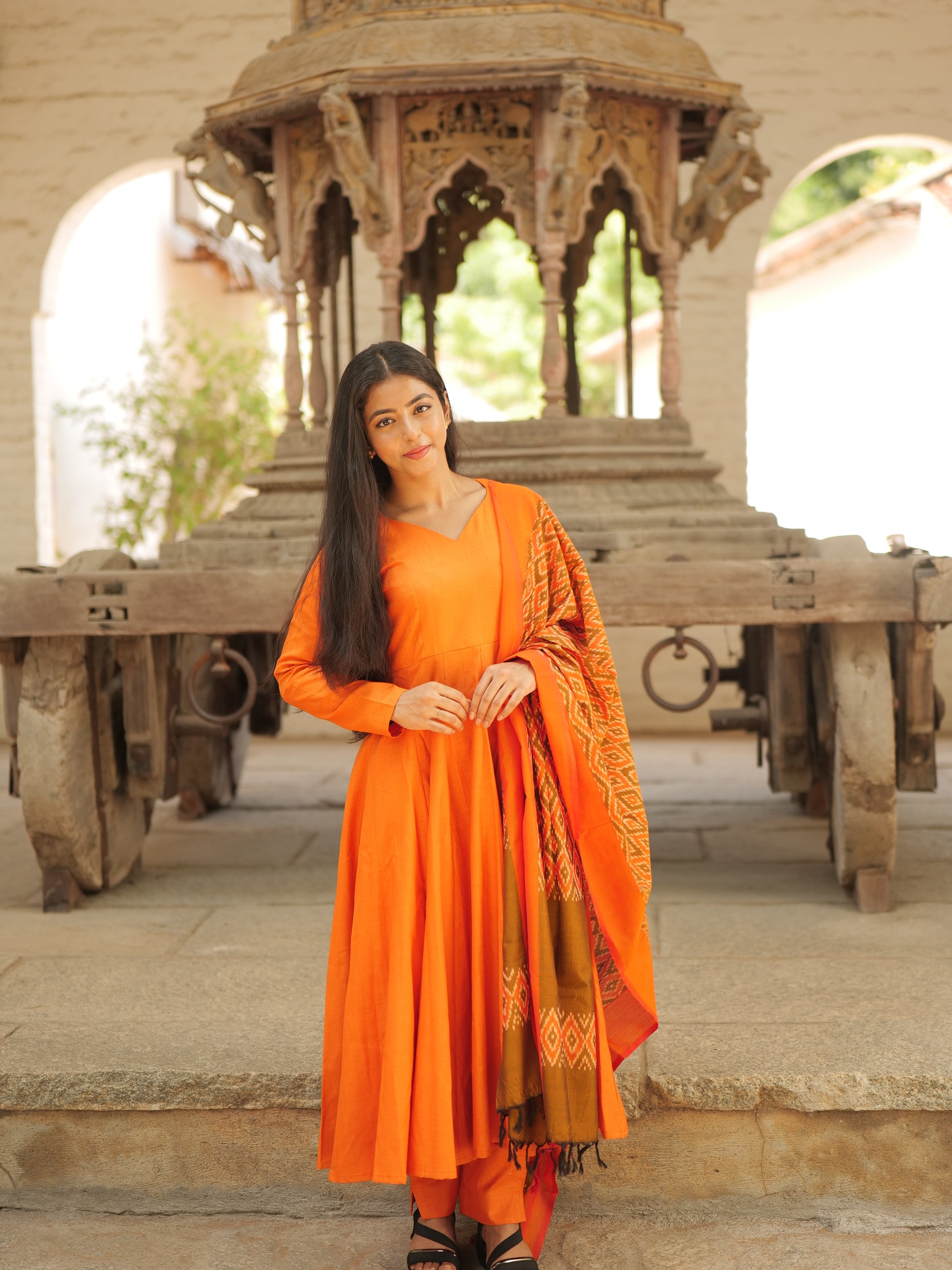 Shawl/Dupatta: Paired with a stunning pure Ikkat silk shawl, handwoven with intricate traditional patterns. The bold motifs and rich colors of the Ikkat provide a striking contrast to the understated elegance of the Anarkali, adding a regal touch.