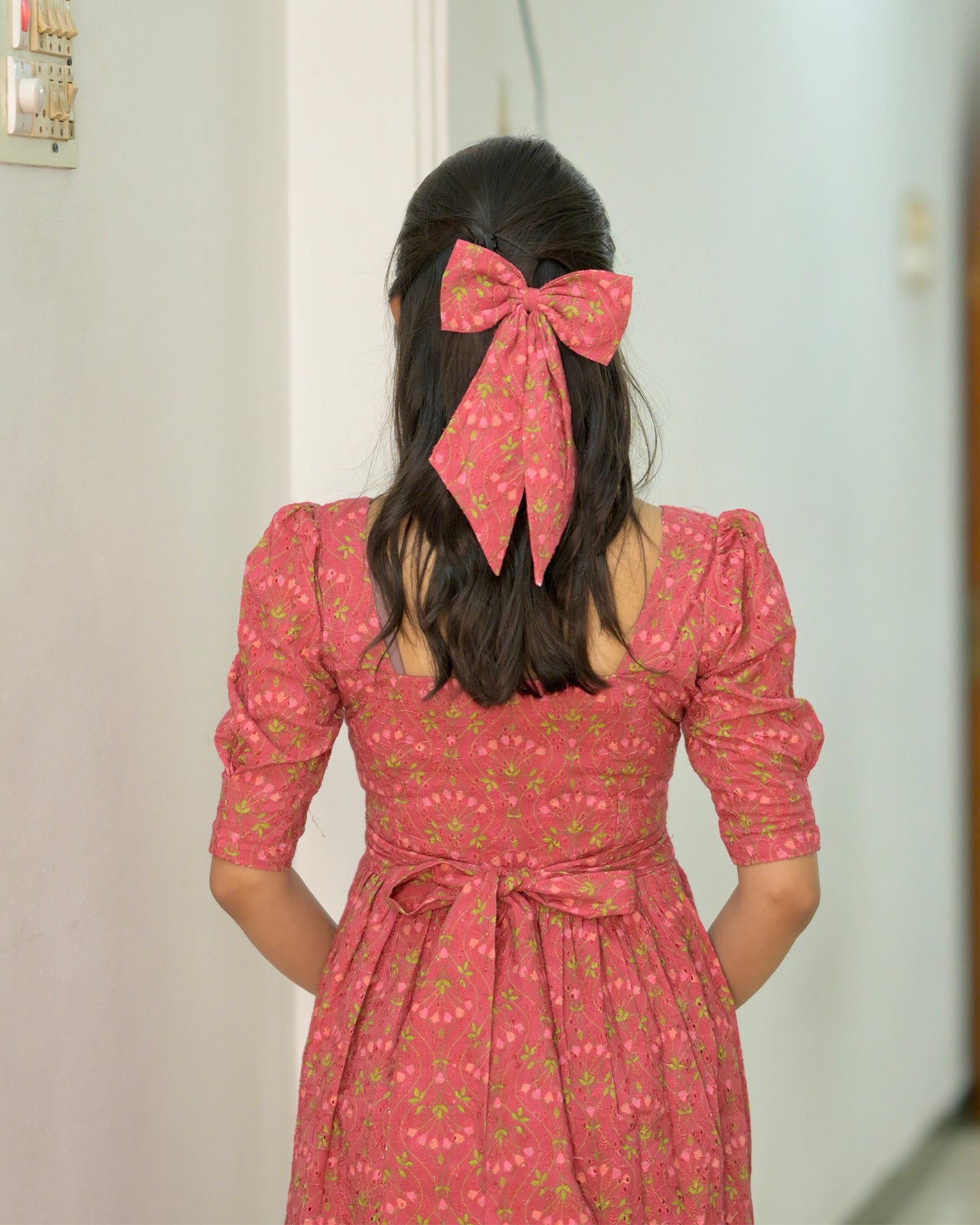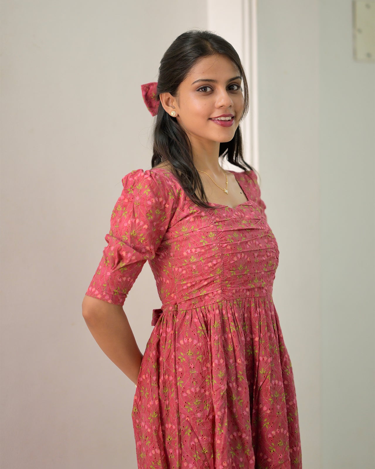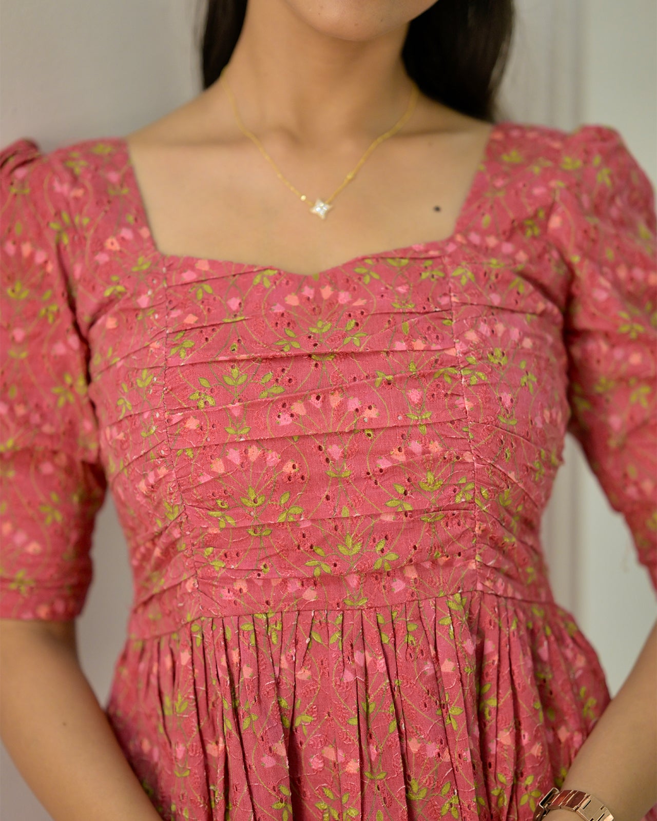 Dipped in rich hues and accented with floral patterns this Hakoba frock is stitched with soft pleats, delicate detailing, and a touch of vintage romance. Whether you’re stepping out for a garden soirée or simply dressing up for yourself, it’s designed to make you feel lovely and light.