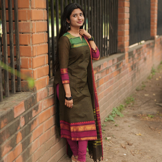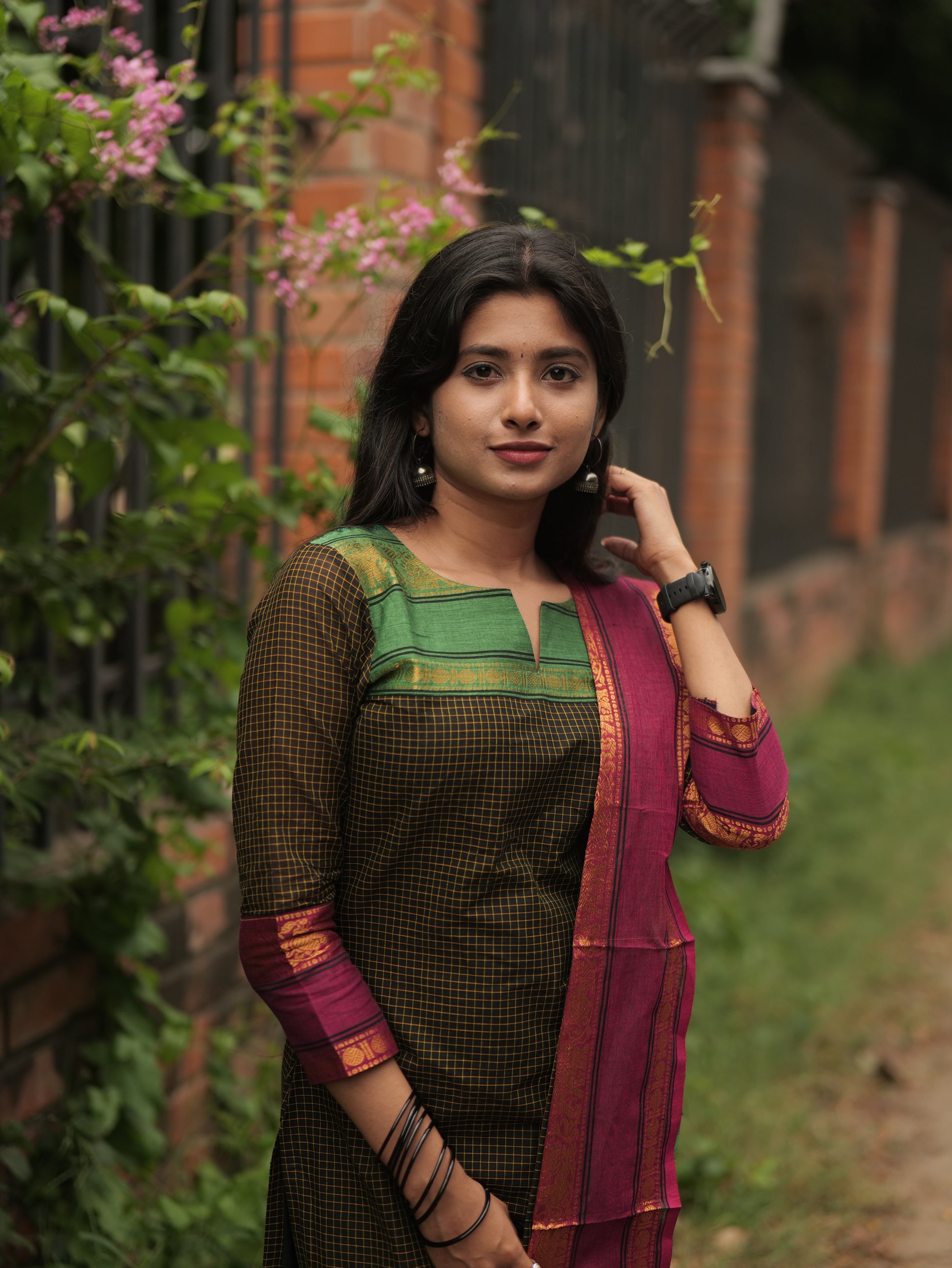 Elevate your everyday style with  our heritage inspired Black Chettinad Cotton Kurti set. The kurti is crafted from soft, breathable cotton with checked pattern and contrasting vibrant border. This kurti is paired with a matching dupatta that blends heritage craftsmanship with modern versatility. Perfect for festive occasions, temple visits or family celebrations.